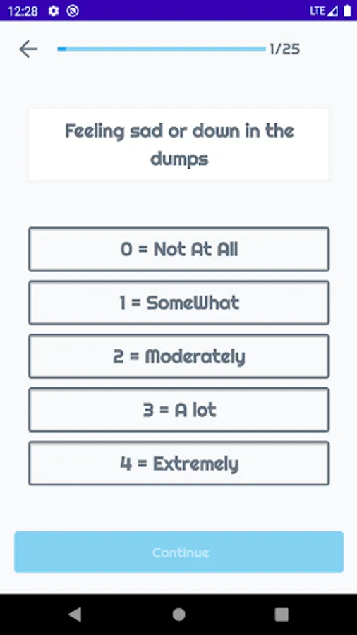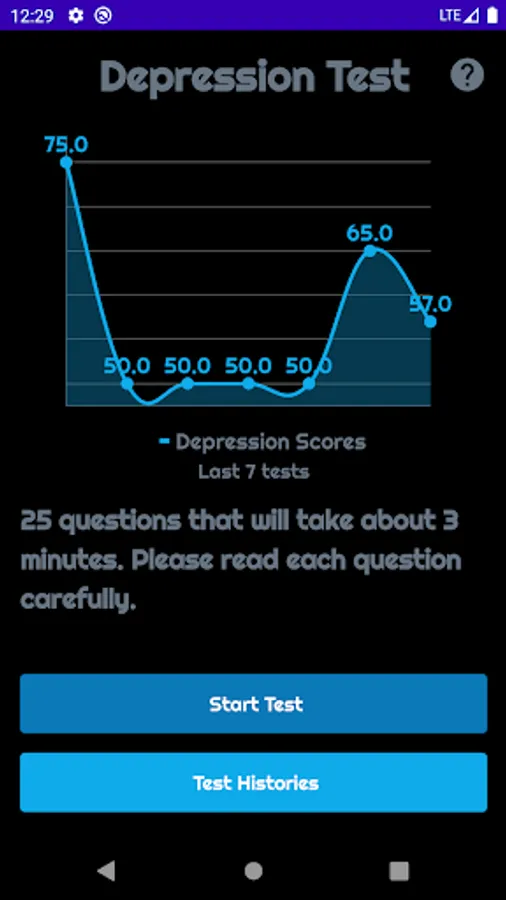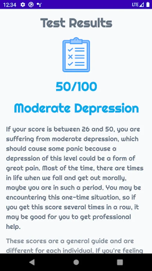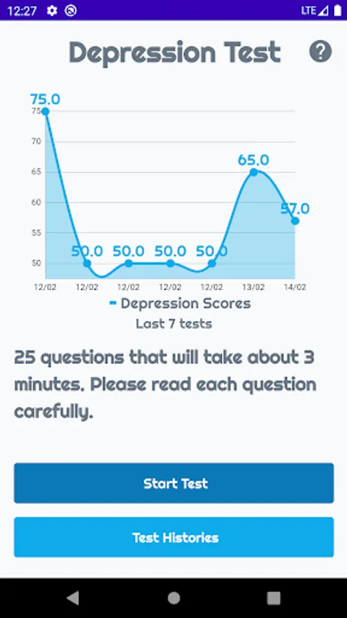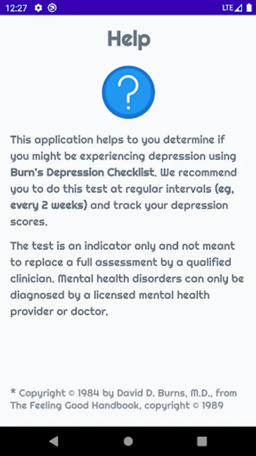 This Depression Test is designed to help you evaluate the severity of your depression with just twenty five simple questions. This app uses the Burn's Depression Checklist which is an empirically-based and self-test questionnaire, in order to calculate your depression score. This depression test quiz almost take 3-4 minutes to finish all the questions.