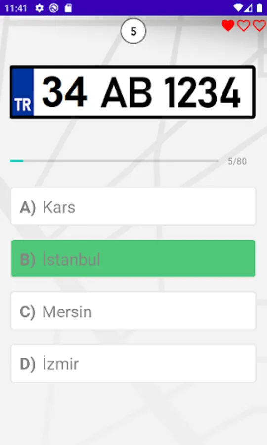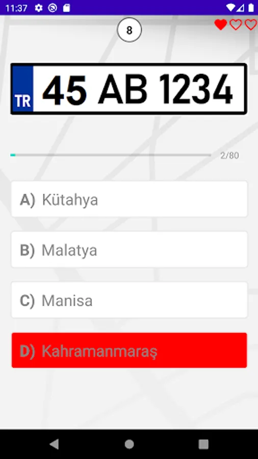 The aim of the game is to guess the license plate codes of 81 provinces correctly. All questions are multiple choice and have 4 options. Each province has its own license plate code and they are all unique, but remembering them all is just as difficult. The application was designed to test your license plate knowledge.