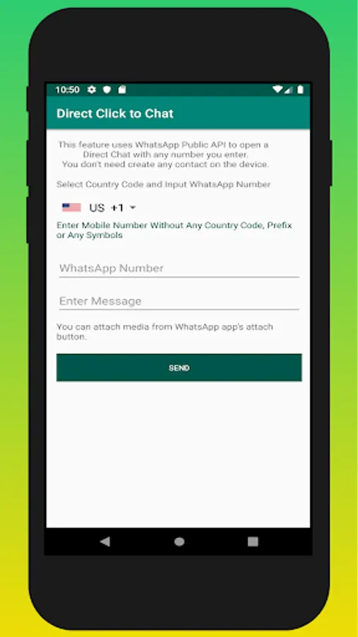 Direct Click to Chat for WhatsApp is based on the "Click to Chat" open api of WhatsApp, and help users to send message directly to someone who is not in your contacts. It's very simple , safe & easy to use.