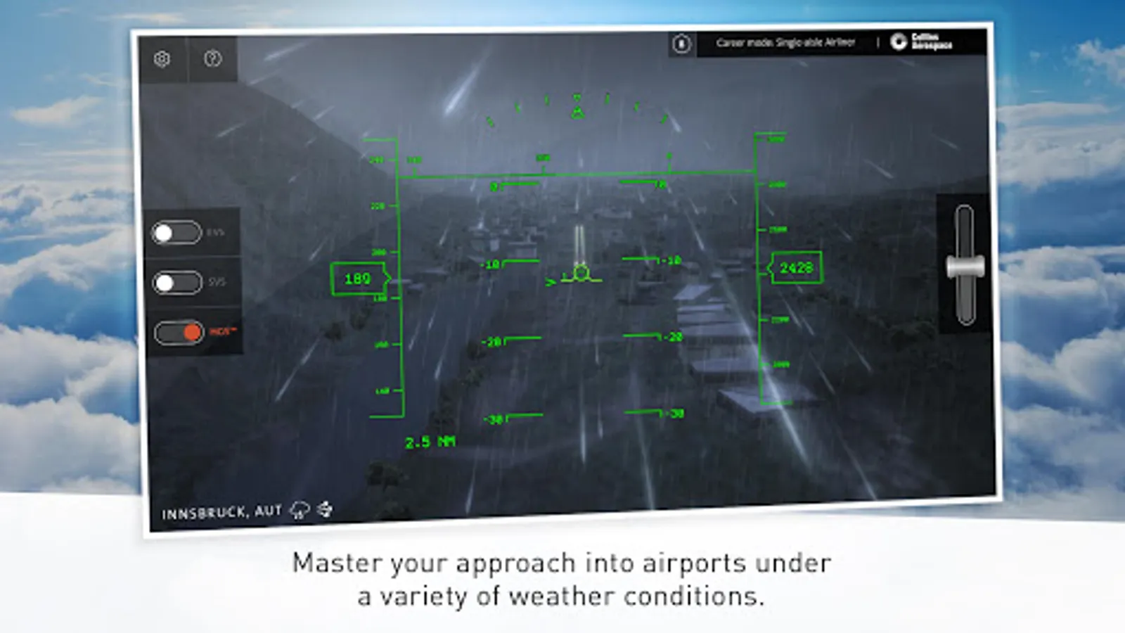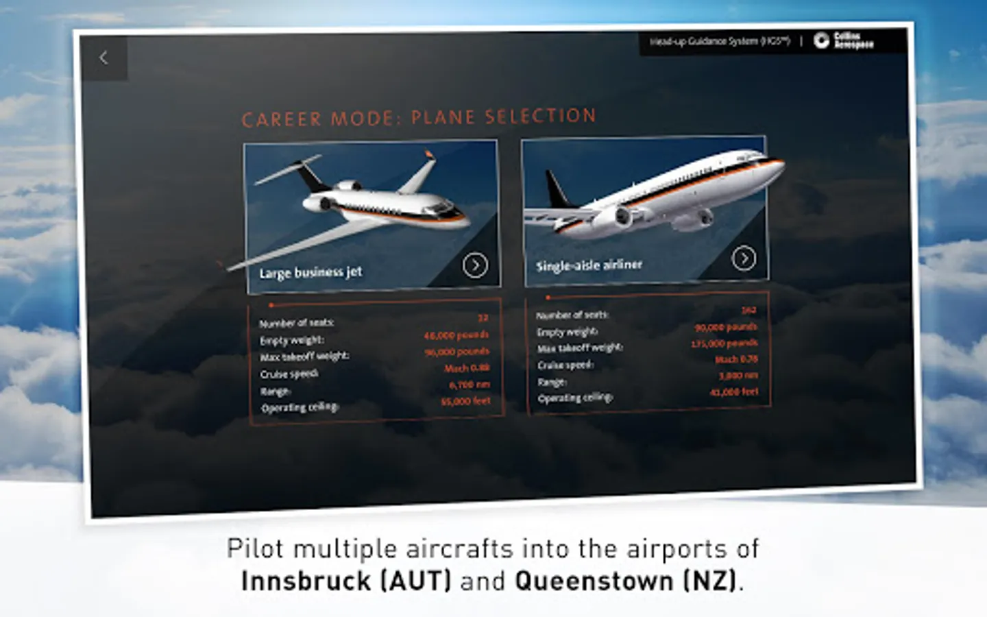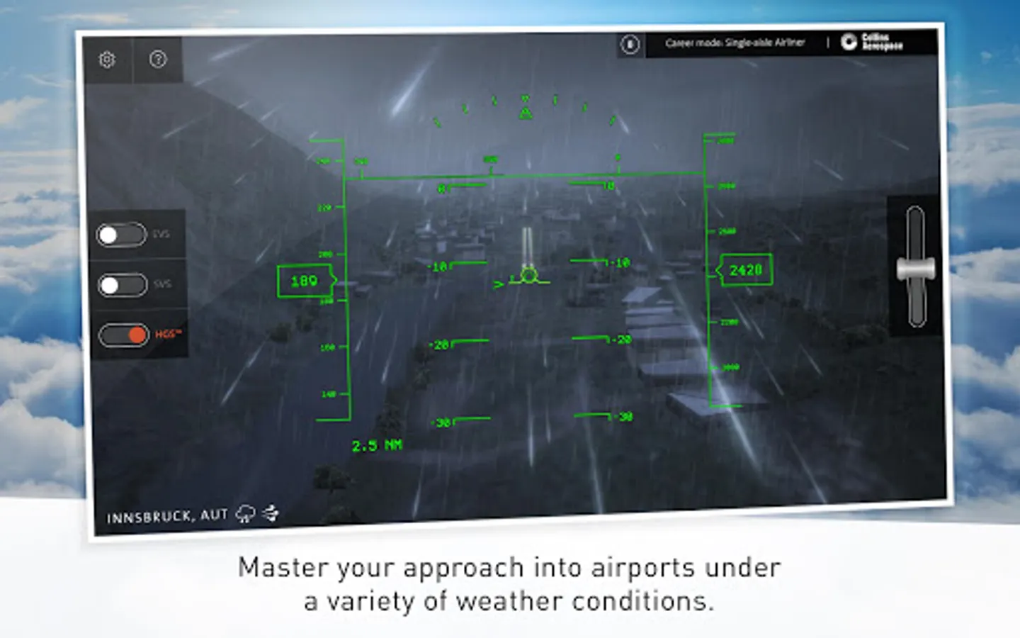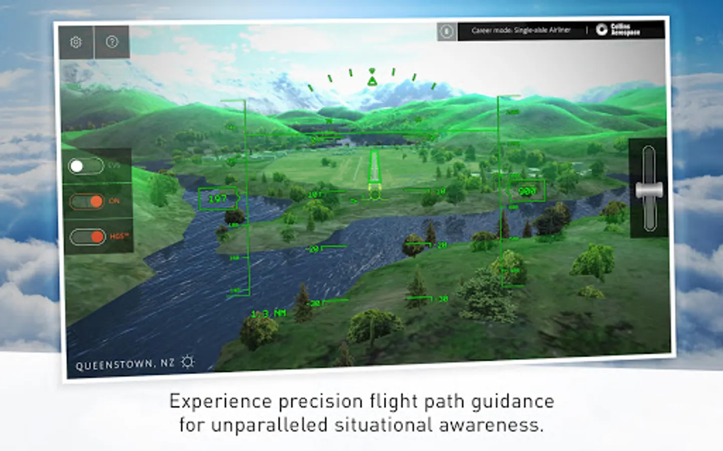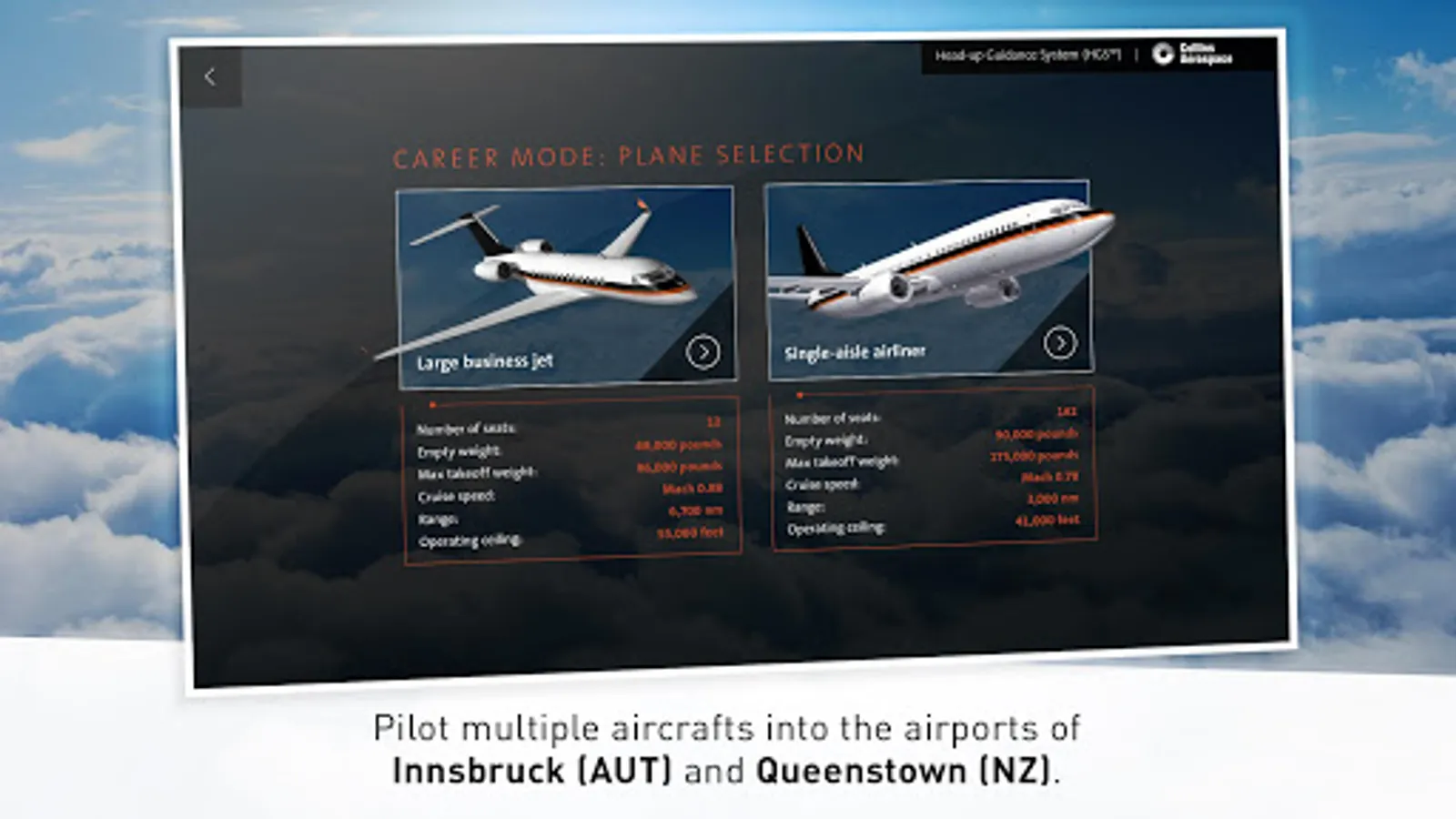 Experience head-up and eyes-forward flying with the Head-up Guidance System (HGS™) from Collins Aerospace. With this application, you can use your Android tablet to simulate flying an approach into Innsbruck, Austria, and Queenstown, New Zealand, under a variety of weather conditions. Use the Career mode to build your skill, or take on the Challenge mode with user-defined settings if you want to create your own scenario. Follow the guidance cue in and see just how much our HGS technology helps you fly precisely, every time.