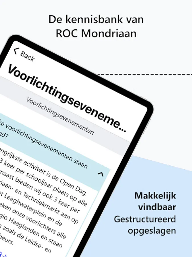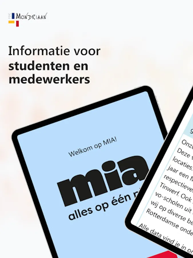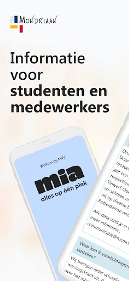 MIA contains relevant information for students and employees of ROC Mondriaan. You have quick and easy access to news, agenda, mail, schedules, figures, the knowledge base and other relevant work and study related applications. In the App you will find the most relevant information. For more and more extensive information, go to mia.rocmondriaan.nl.