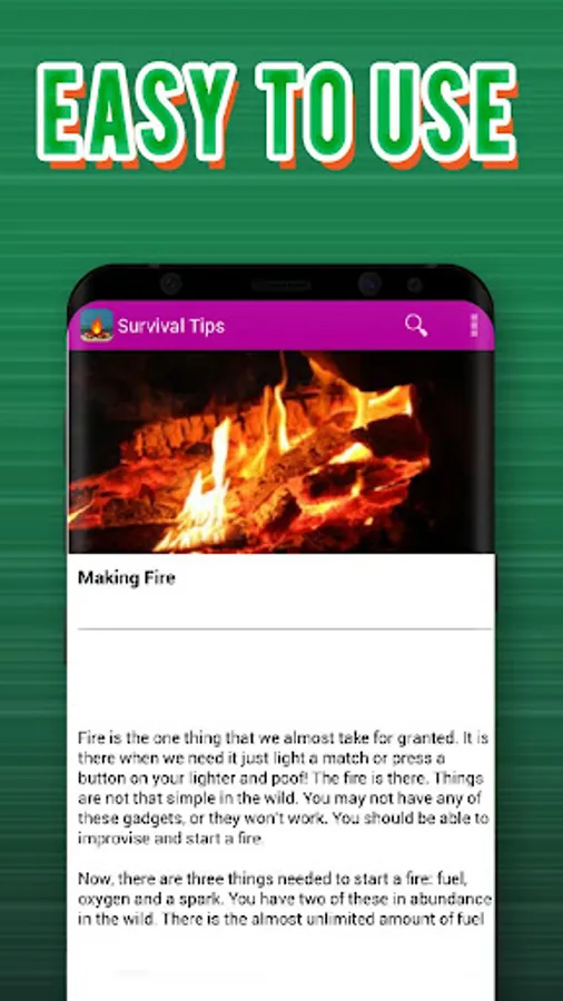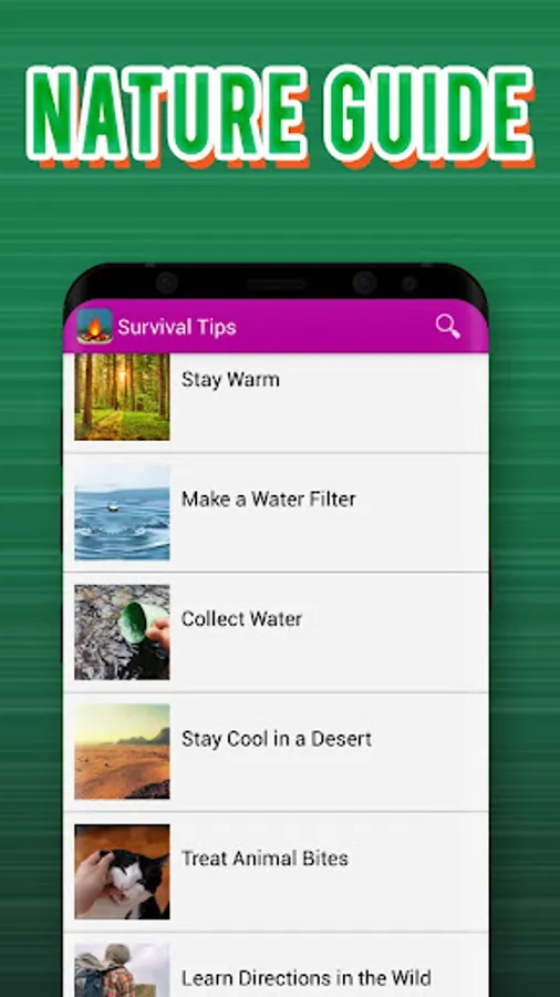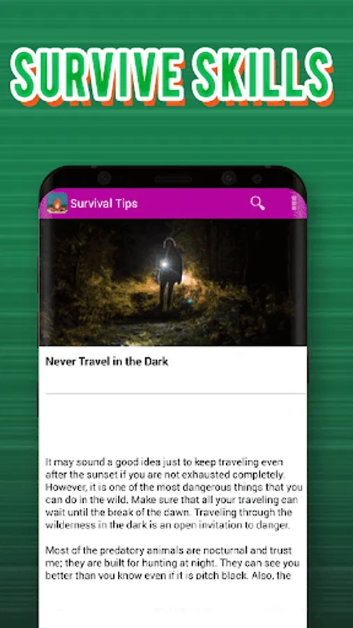 Ultimate Survival tips app can be also useful for trips to the outdoors, hiking, camping, learning about nature and yourself truly. This is not only fun, but you can also train skills (find and filter water, find food, heal wounds, make fire, build shelter, Plants, Fishing, Treat Animal Bites ..) you need to know it before starting your adventure.