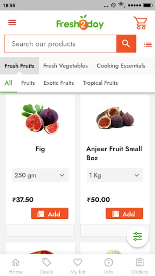 Fresh2Day is Chennai’s best Fruits & Vegetables and grocery store. With over 2000 handpicked products in the catalogue, you will find everything you are looking for. Right from fresh Fruits and Vegetables, Rice and Dals, Spices and Seasonings to Packaged products, Bakery Products, Beverages, Dairy & all Groceries