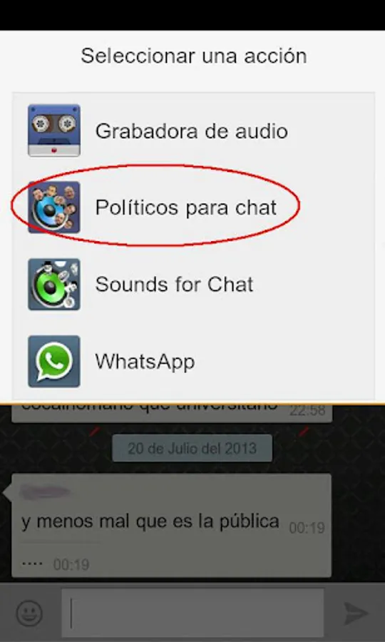 En cualquier caso, con Politicos para WhatsApp podrás enviar sonidos de la casta de manera rápida y sencilla a través de WhatsApp o Telegram... ¡desde ya!, solo necesitas descargar la aplicación desde Google Play, navegar por las diferentes secciones, selecciona a Rajoy, Aznar, Zapatero, Rubalcaba, al Rey Juan Carlos, Pablo Iglesias de Podemos, etc, y comparte sus frases más divertidas con tus amigos en WhatsApp o Telegram.
