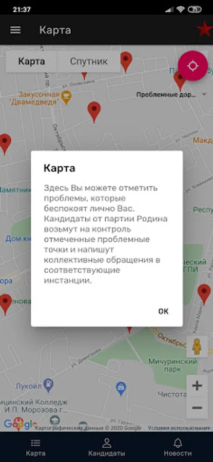 The application is an interactive platform that clearly reflects the problems of residents who will take control of candidates for deputies from the Motherland Party in the city of Syktyvkar. While the application works only for the city of Syktyvkar and its environs.