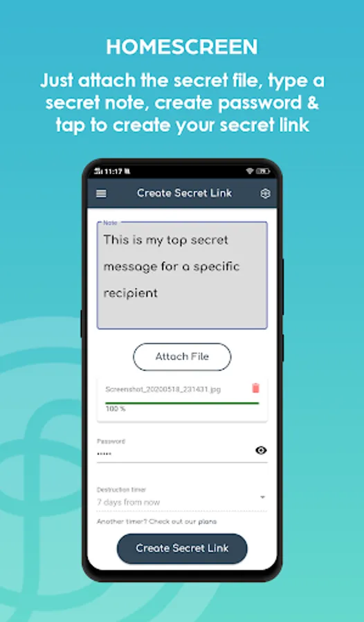 Your recipient can only click the link once. Afterwards the message is destroyed for ever. A second view or visit is impossible, because we don't only flag the data that it was called but we also delete the whole message and its attached files for ever!