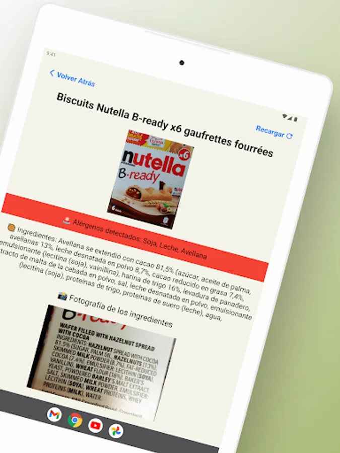 - Shows the name of the product, the photo of the product, the translated ingredients (in case they are in another language) and the photo of the original ingredients of the product