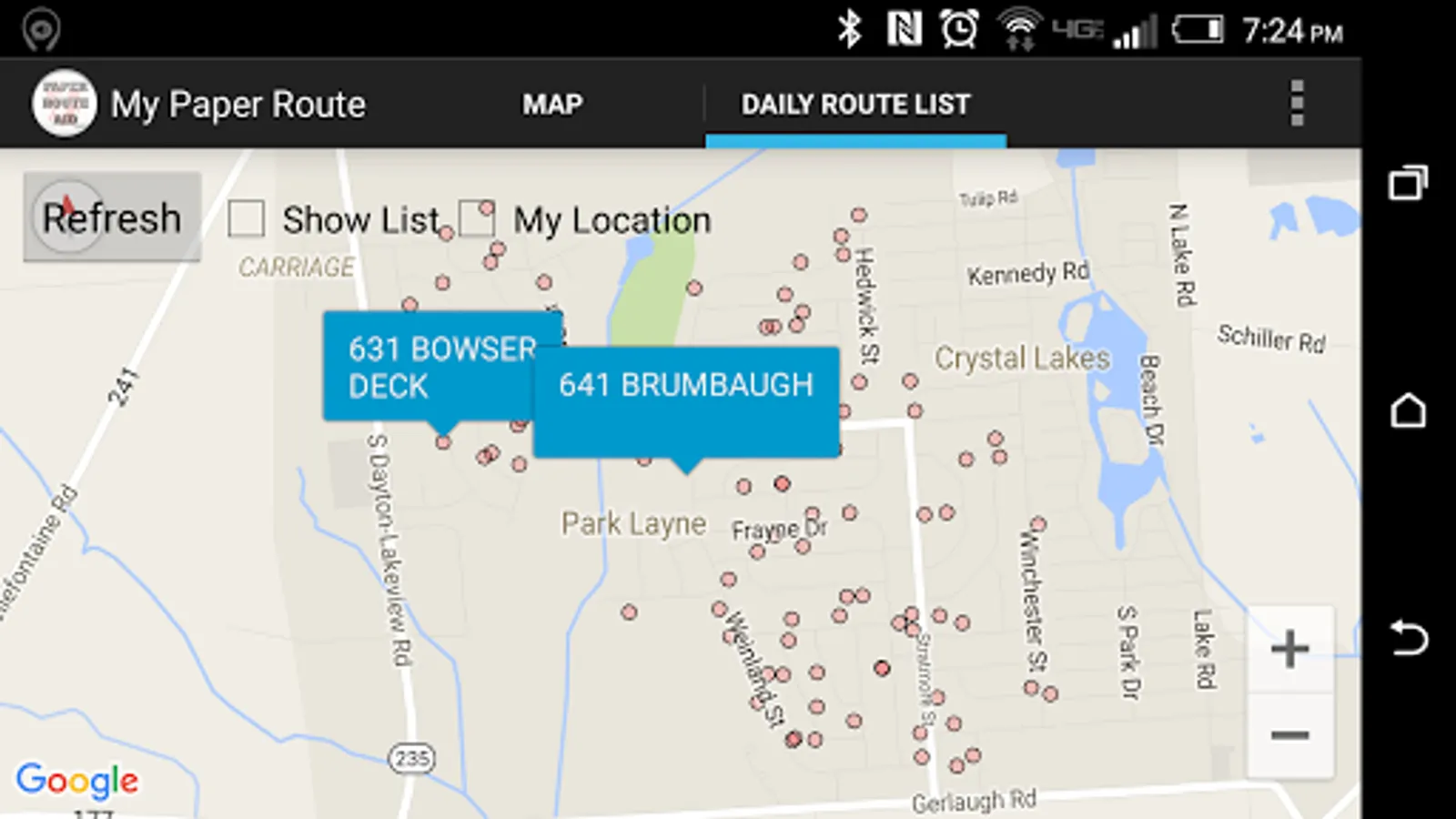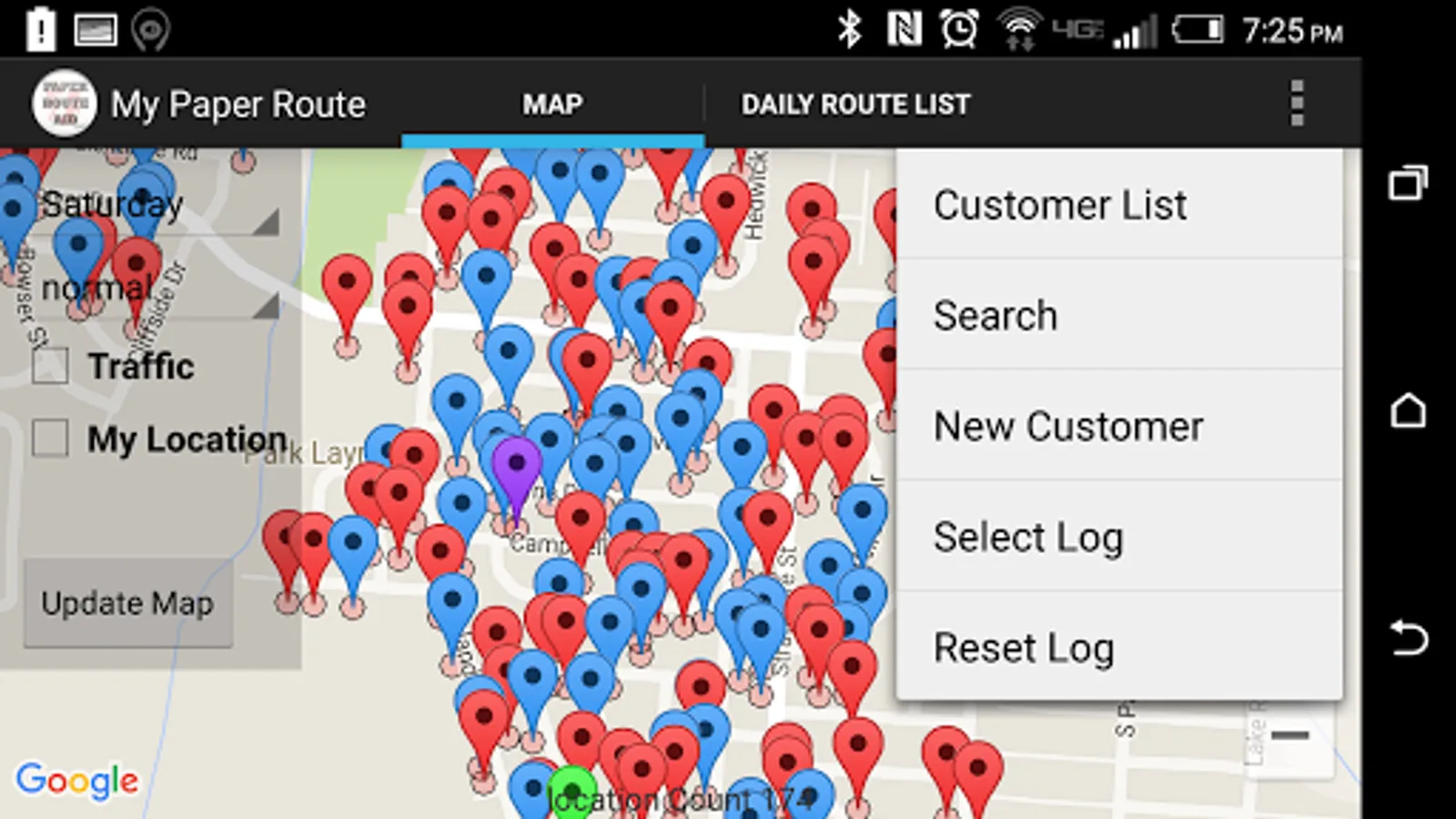 The paper route app contains a GPS map with markers that are filtered by delivery day. It shows the current days customer list on an easy to read map display that follows as you move. With the paper route app, you can customize each customer with different marker colors for ease in delivering multiple papers, record tips and complaint history for each customer and set a delivery target time. This app contains a daily log with check boxes so you can record the time delivered and view past logs of your route. You can put customers on vacation to remove them from the map.