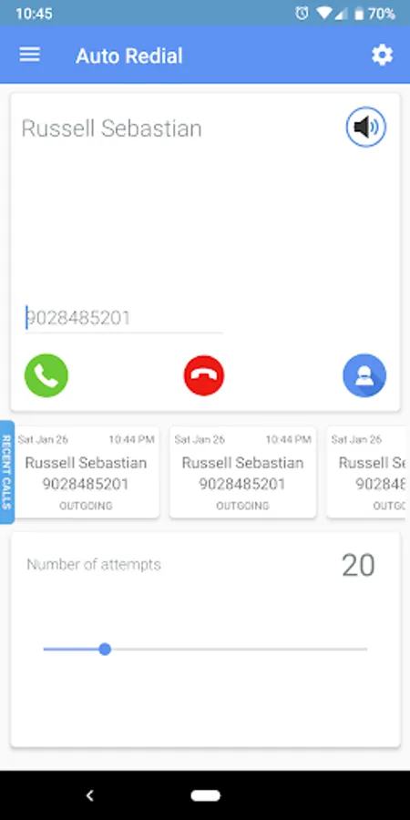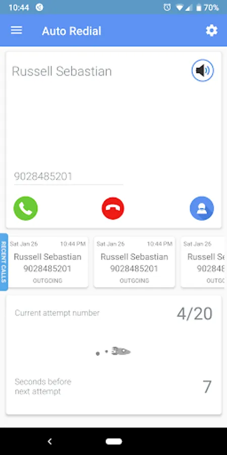The app stays true to its name by automatically redialing a number upto 101 times in a maximum of 2 clicks. Last incoming/outgoing number is automatically populated! In that case you're just 1 click away from redialing that number. Fetch a contact from your saved contacts or select one of the recent contacts to dial. Default settings are optimally selected so you won't have to spend any more time fiddling with them, unless you really want to.