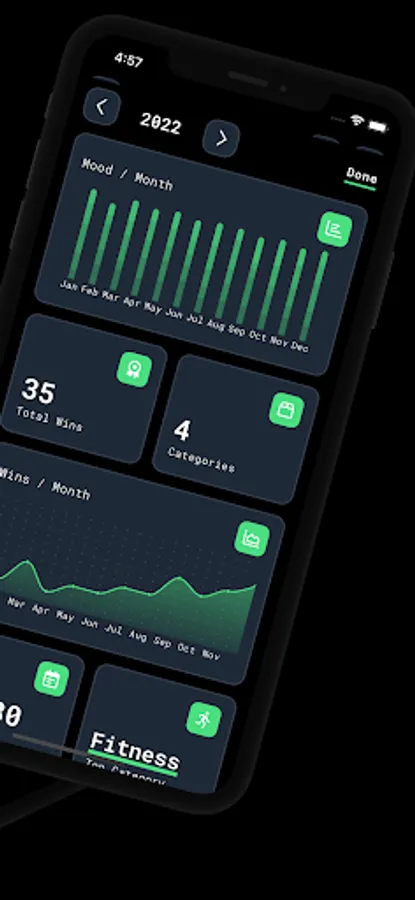 Visualize your progress with the app's built-in charts and statistics. Gain insights into your achievements over time, see the breakdown of wins by category, and discover your most significant areas of growth.