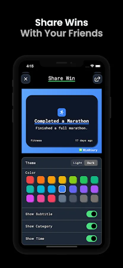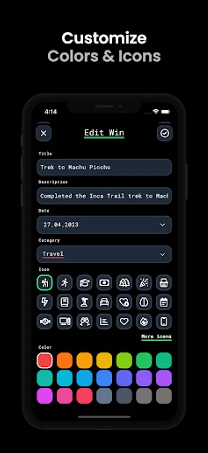 Fast and easy input of your wins. Just add a title, description, select a category, add an icon, and choose a color, and you are all set to celebrate your achievement.