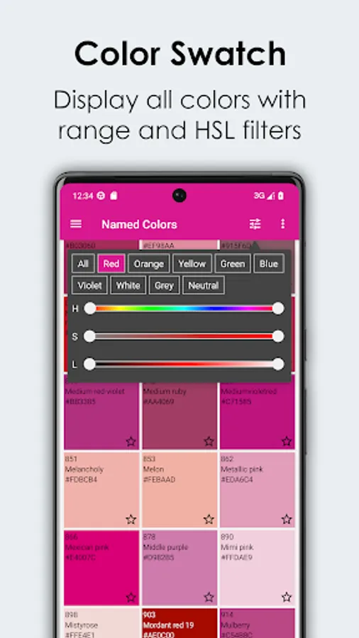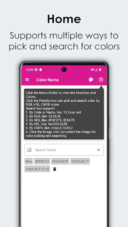 1. Support searching color by code, name, RGB, HEX, HSL, CMYK