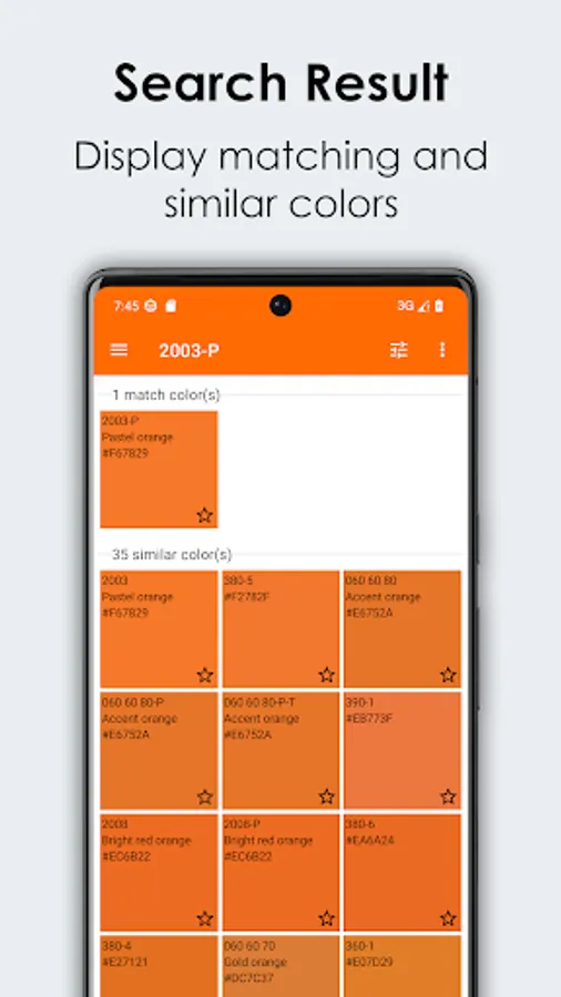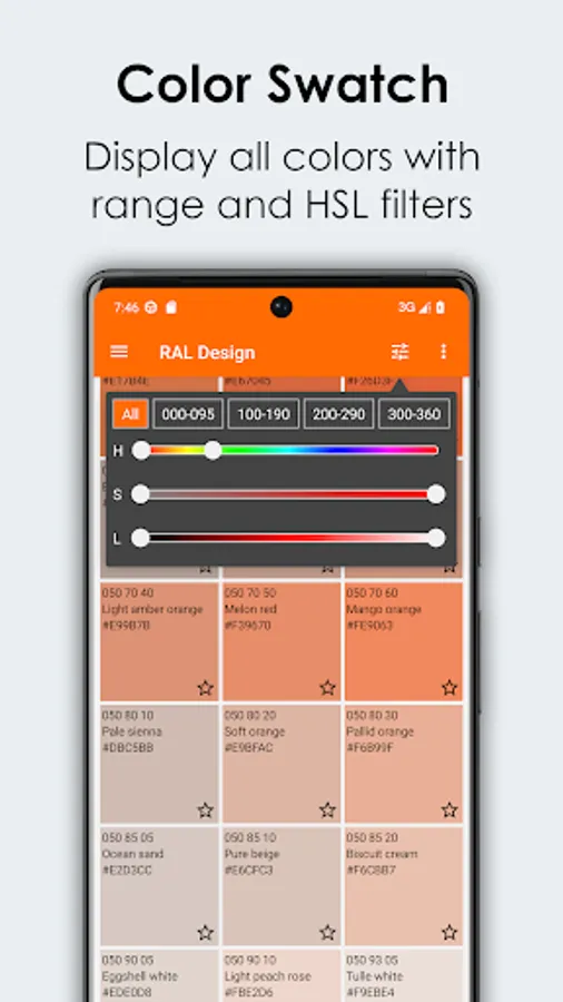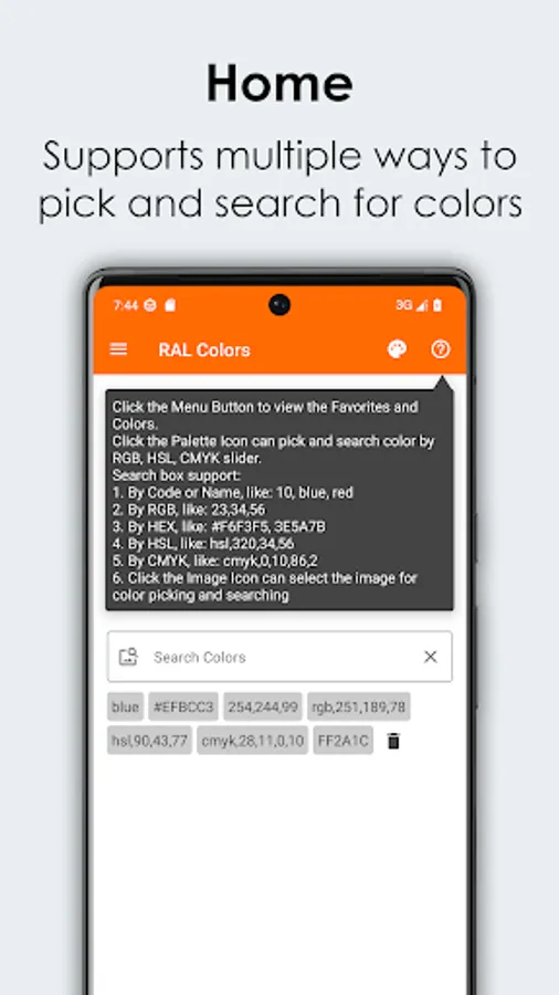1. Support searching color by code, name, RGB, HEX, HSL, CMYK