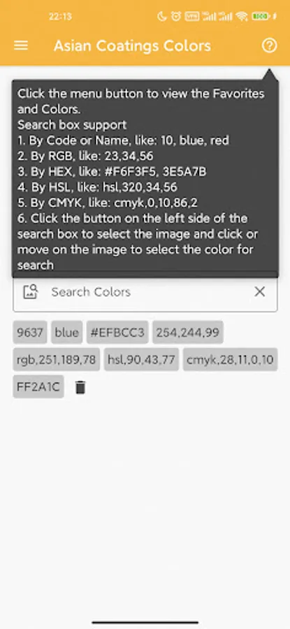 1. Support searching color by code, name, RGB, HEX, HSL, CMYK