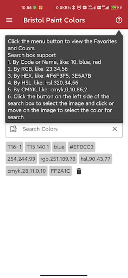 1. Support searching color by code, name, RGB, HEX, HSL, CMYK