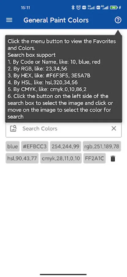 1. Support searching color by code, name, RGB, HEX, HSL, CMYK