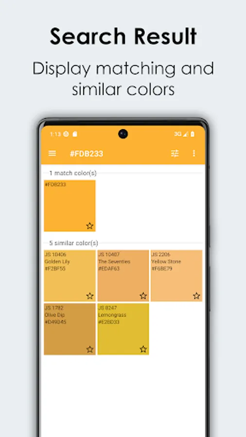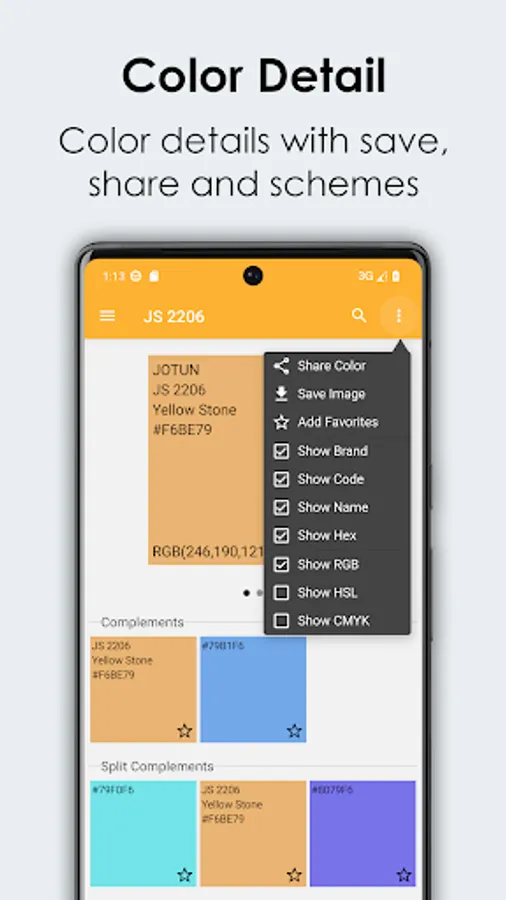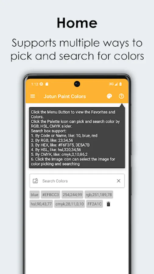 1. Support searching color by code, name, RGB, HEX, HSL, CMYK