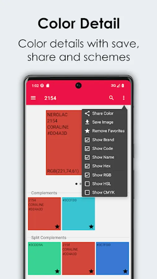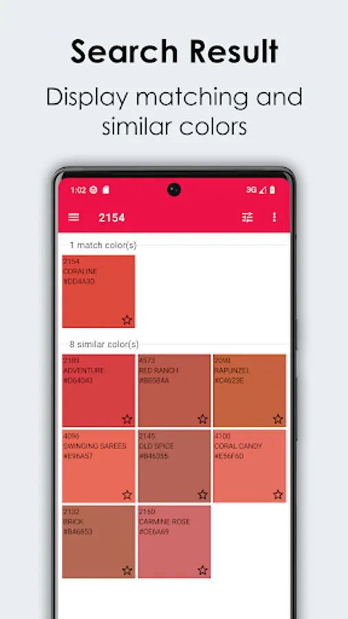 1. Support searching color by code, name, RGB, HEX, HSL, CMYK