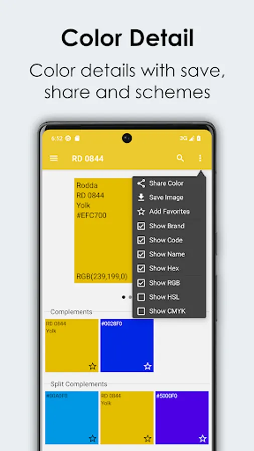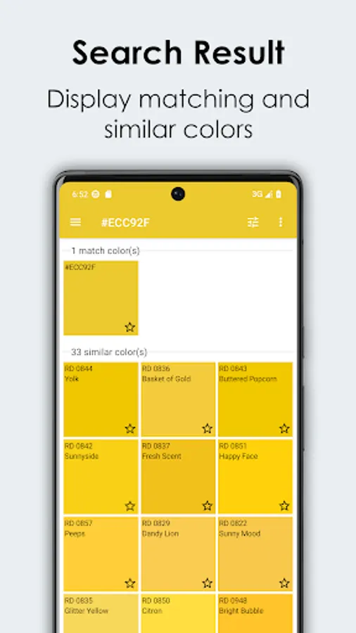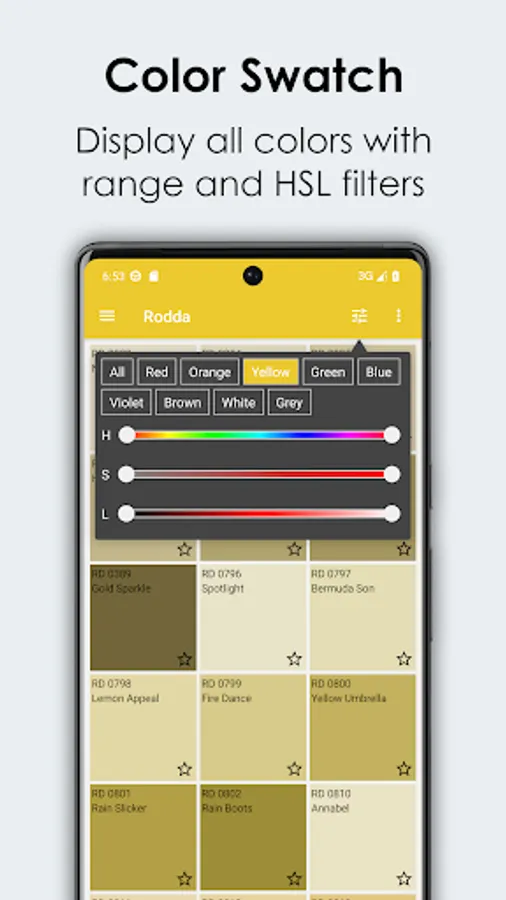 1. Support searching color by code, name, RGB, HEX, HSL, CMYK