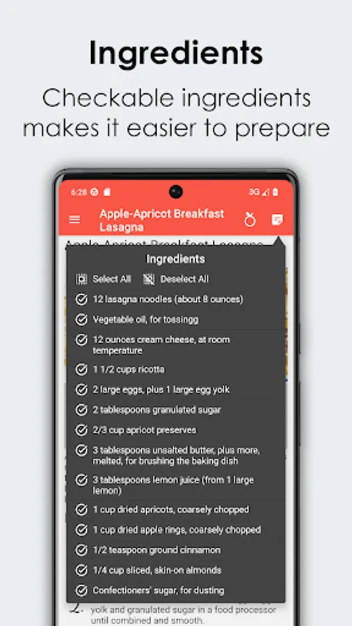 • Checkable ingredients lets you know what you have got and what else you need.