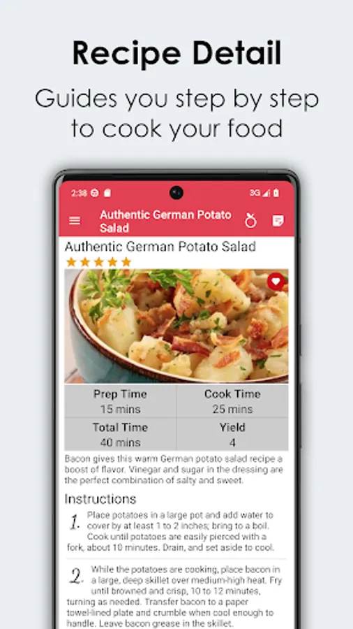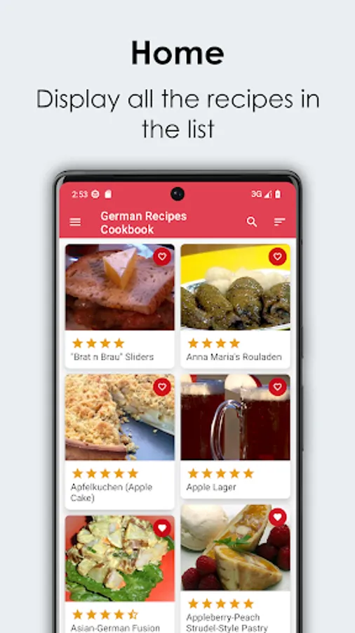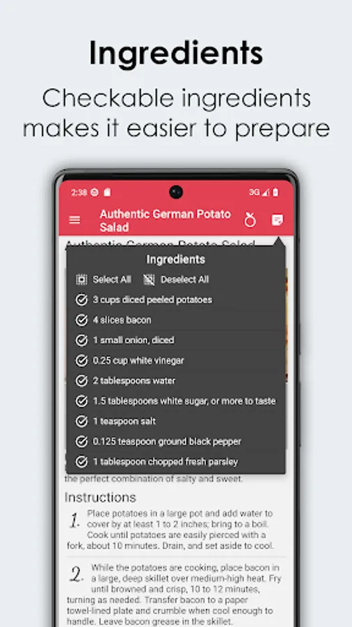 • 400+ offline recipes for German dishes, including cake, potato, salad, chicken, sauerkraut, and more.