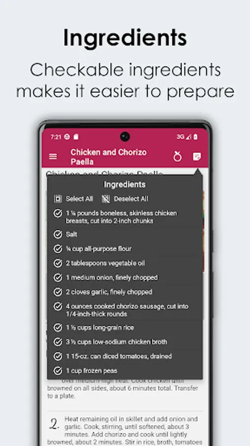 • 400+ offline recipes for Spanish dishes, including chorizo, rice, tortilla, paella, gazpacho, and more.