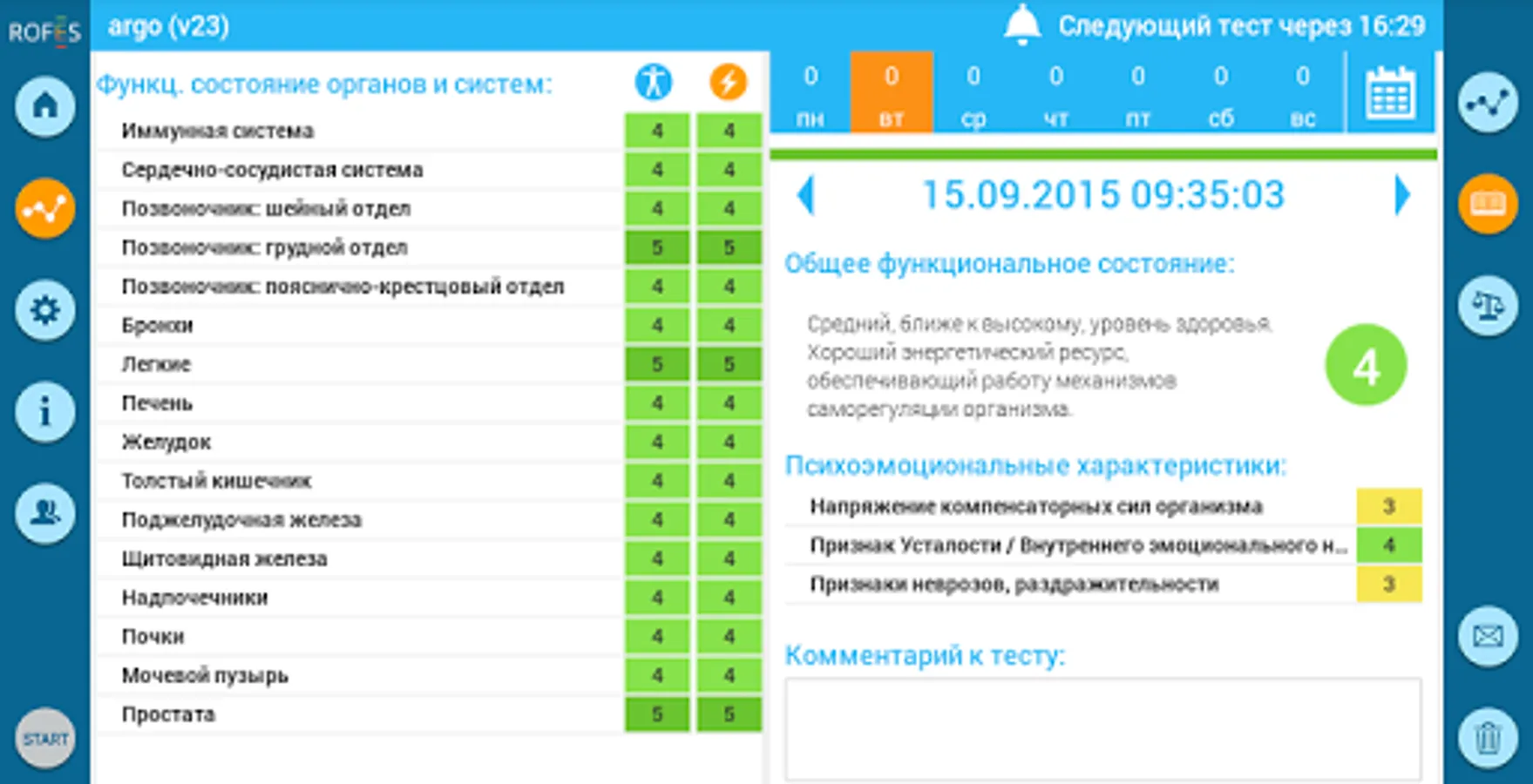 The hardware-software complex ROFES tests the general state of the body, evaluates the psychoemotional and functional state of 17 main organs and systems of the body. ROFES is designed for systematic health monitoring. This makes it possible to notice in time problems that can lead to illness, prevent illness or consult a doctor in a timely manner. With its help, you can record the impact on health of taking any dietary supplements or drugs, bad habits, unhealthy diet, exercise, etc.