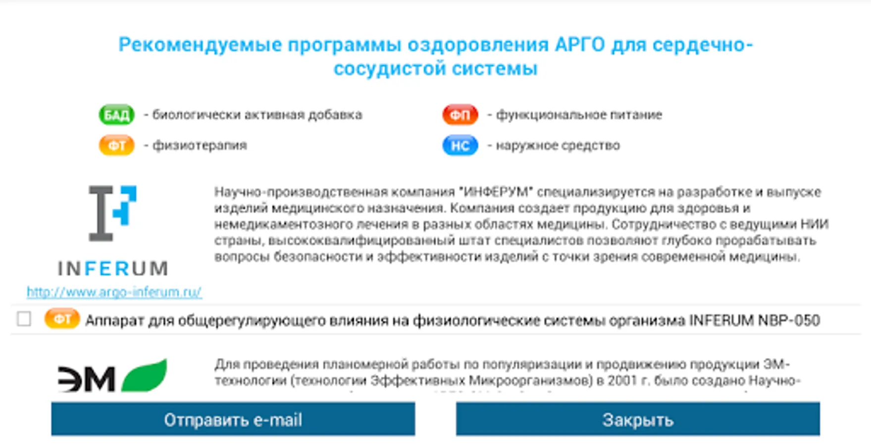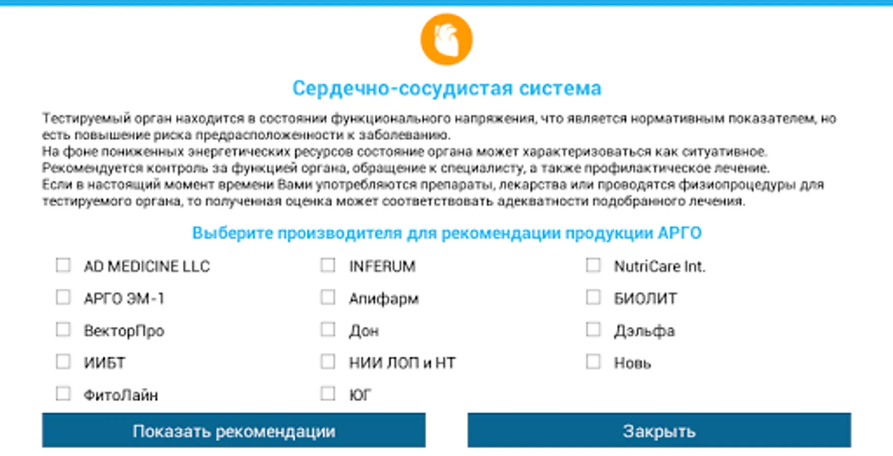 If you receive lower grades in the program, you have the opportunity to familiarize yourself with the list of manufacturers and the range of products for recovery from the ARGO Company for the tested organs and systems.