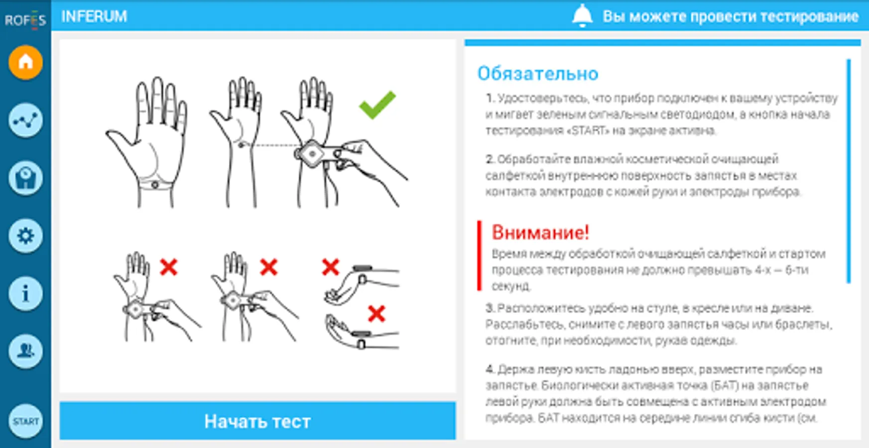 "Fito TEST" takes information from the biologically active point MC-7, located on the wrist of the left hand. The active electrode of the device sends a weak electrical signal and registers the body's response to this effect.