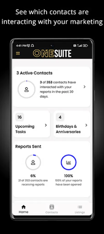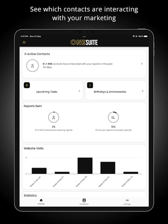 Download the ONE Suite CRM App to be more productive on-the-go! Use this app to access your ONE Suite contact database and property details directly from your phone. The CRM App updates in real-time and even has push notifications, so you never miss a beat. Create a mobile Open House Registration Form within just seconds, for easy lead capture, too!