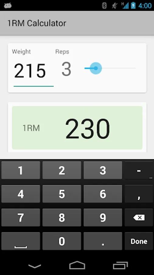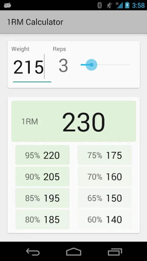 Simple, useful weightlifting/fitness app to estimate 1RM (one rep maximum) given a weight and number of reps.