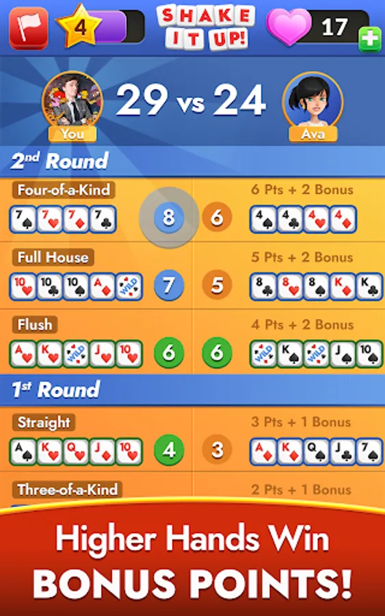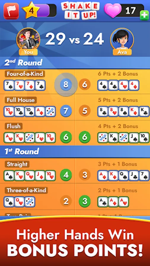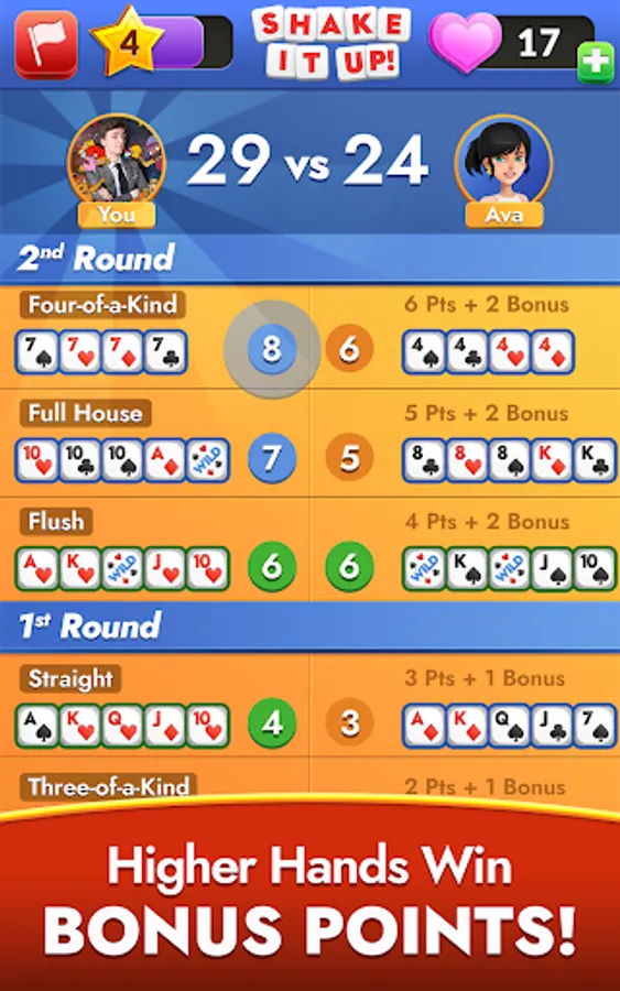 - The player with the higher card hand wins bonus points!