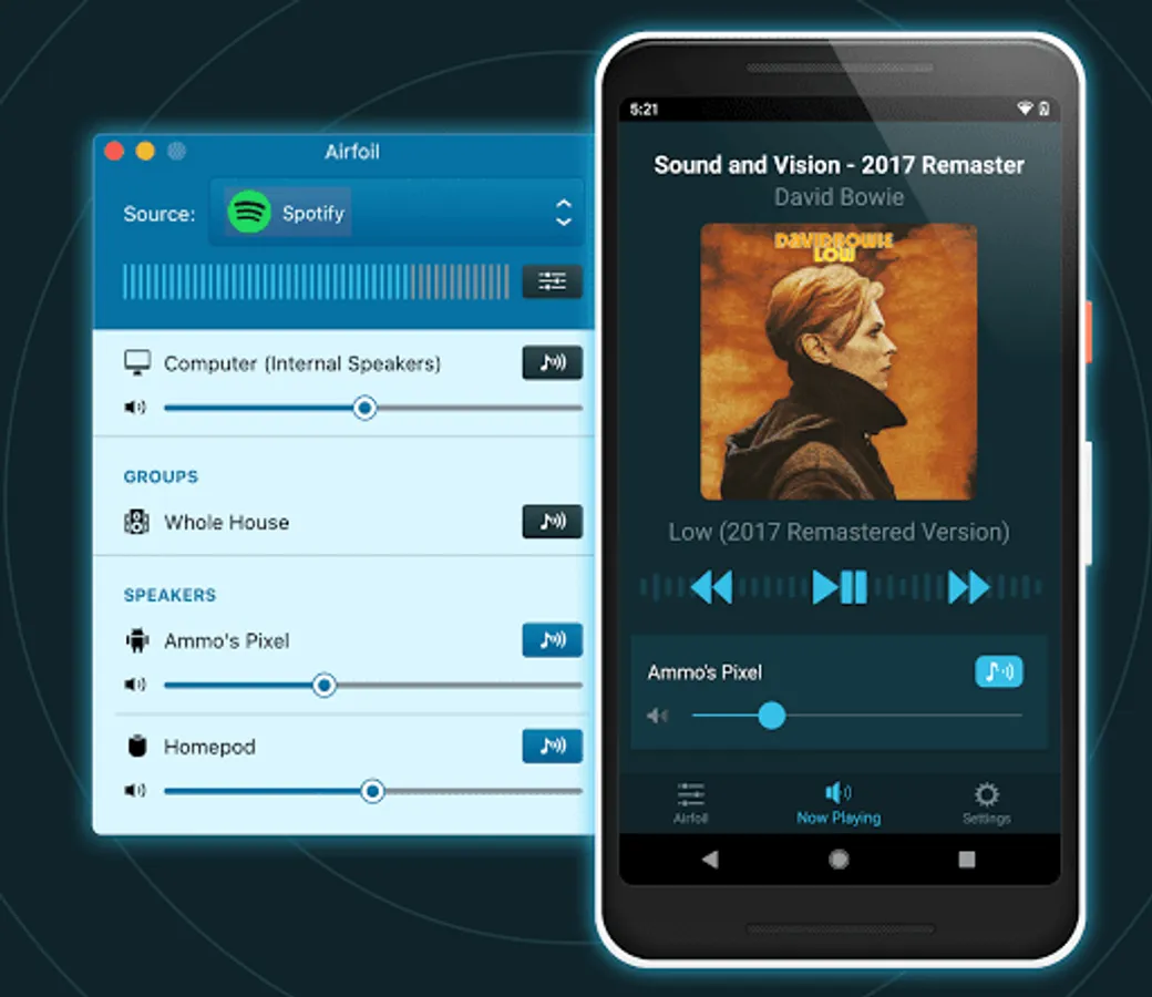 Send any audio from your Mac to your device using Airfoil and Airfoil Satellite. Plug in headphones to your Android device or dock it in a speaker, then send audio to it wirelessly from anywhere in the house.