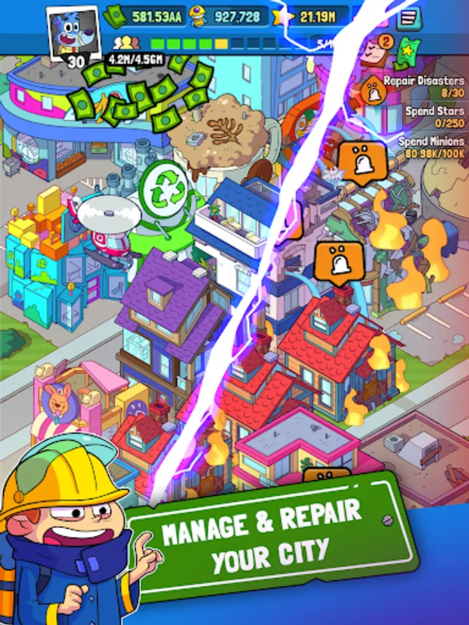 Your loyal legion of minions are ready to fly into action. The more you can mitigate the disaster damage, the more people will flock to your town, bringing their votes and money with them!