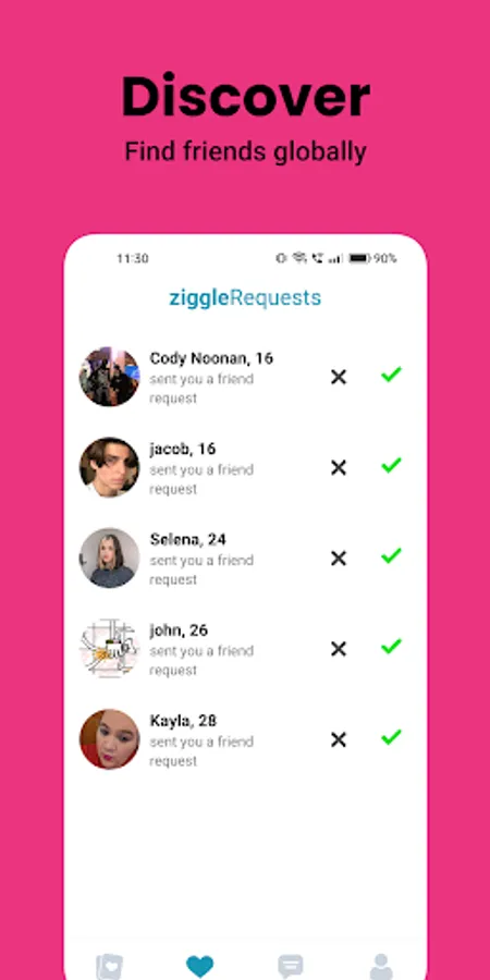 Swipe right and left through tons of new faces from all over the world. Check out each person’s profile to decide if you think they could be your new friend! That girl loves soccer, just like you? Swipe right! Instant friends. This guy likes the kind of music you can’t stand? Swipe left! No problem. On Ziggle, you can connect with so many people you have things in common with. Start swiping to meet your new besties!