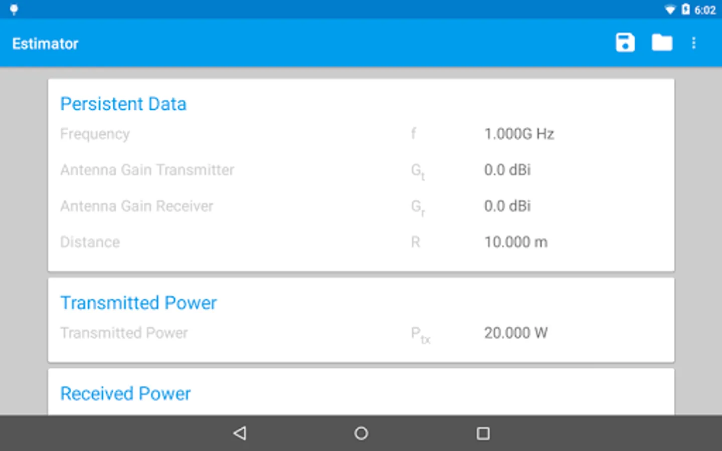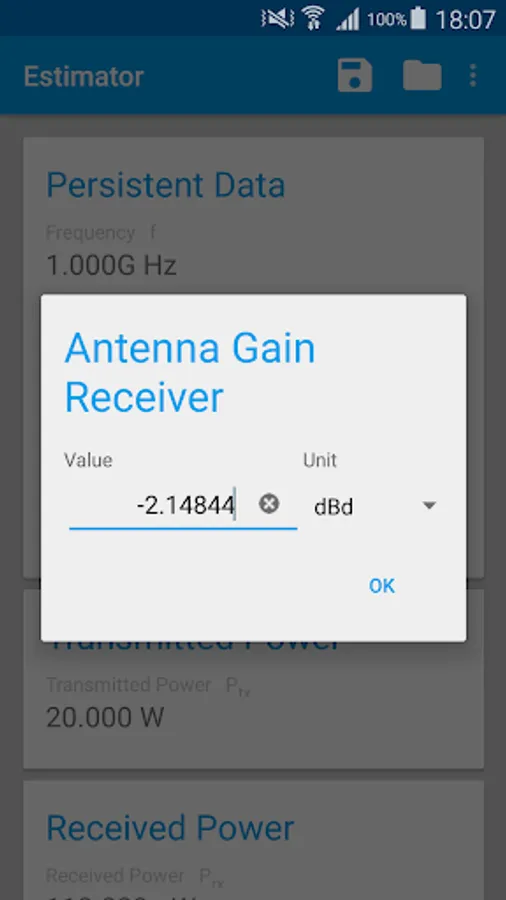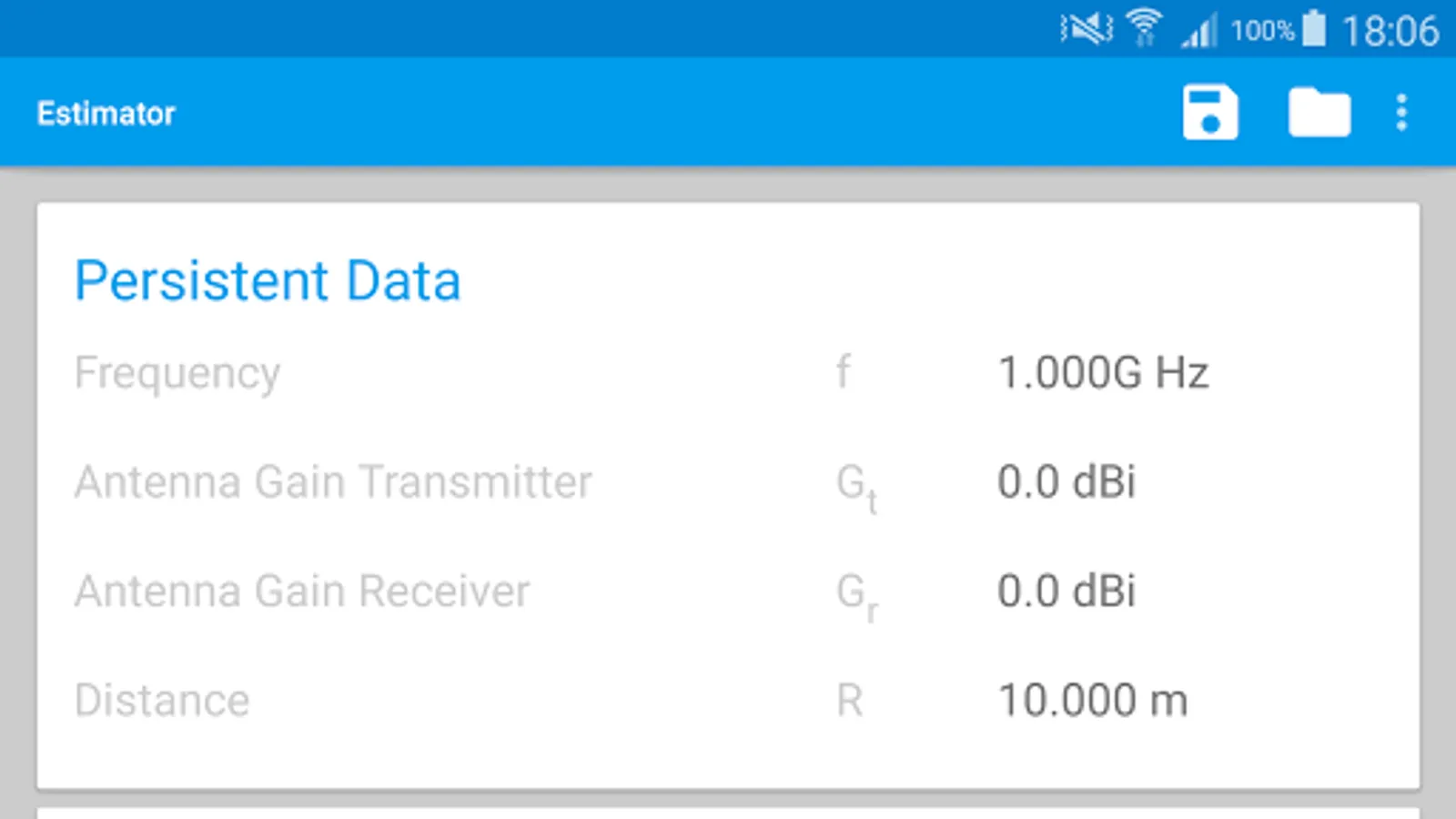 When changing one of the other values however, Frequency, Antenna Gain Transmitter, Antenna Gain Receiver and Distance will keep their values (the "Persistant Data" values).