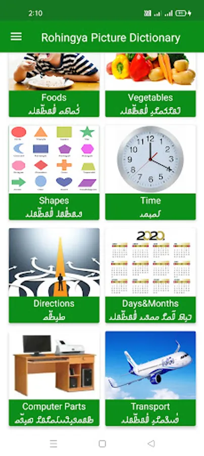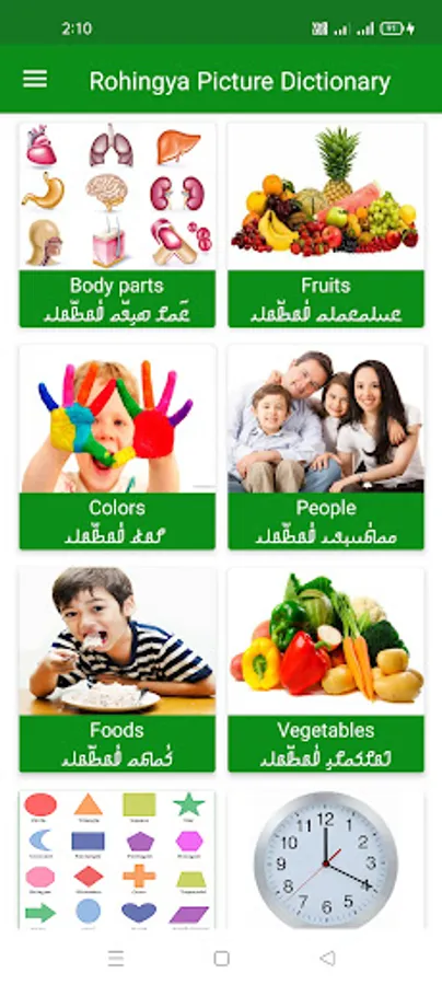 The Rohingya Picture Dictionary App is designed for people and students who wish to learn Rohingya language and vocabulary, or to improve their English vocabulary with Rohingya translation. The app covers necessary topics of daily life activities. With the help of pictures, you can become familiar with your every day vocabulary. Depending on your stage of development, this app will be ideal for you. The app is perfect for slow learners in more advanced classes, and even special needs individuals can learn by using it. It contains more than 900 words as of now.(I hope we will be adding more categories and words in the future, have fun with Rohingya Language!) By touching the list item, you can select your topic and tap on the picture to listen to the English pronunciation, and the play button will allow you to listen to the Rohingya language translation.