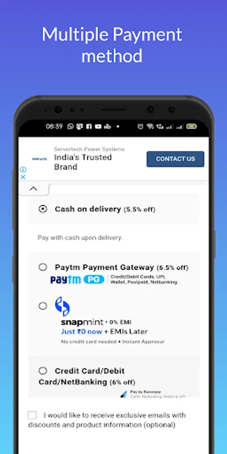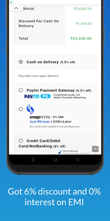 Solution: By joining Navjeevan, you can buy products on easy installments. There are many opitons available with us like Zestmoney, Snapmint, Onecard, Debit Card EMI, Credit Card EMI, Cardless EMI.