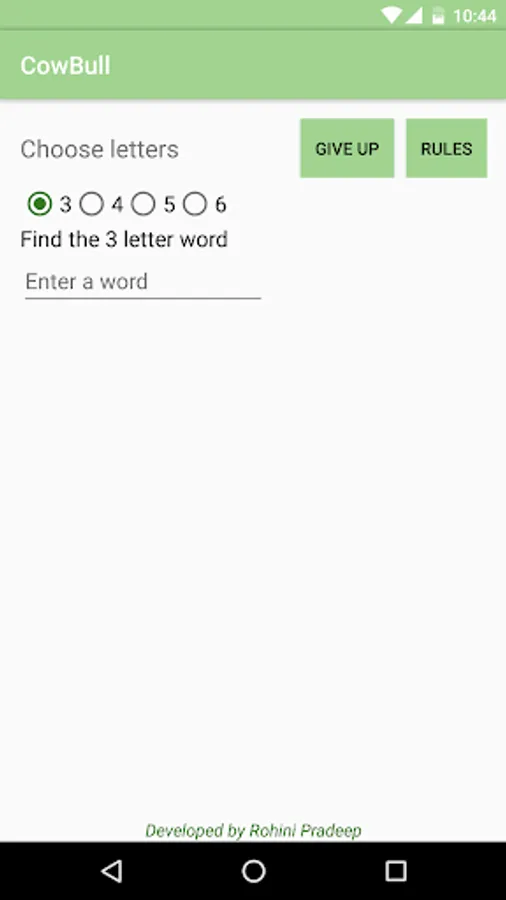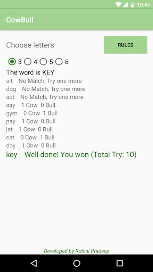 Cow Bull Word Game is also known as MasterMind. Mobile thinks an X letter word. The player tries to find it. X is selected by the player. At each turn, mobile says how close the answer is by giving a tip as below.