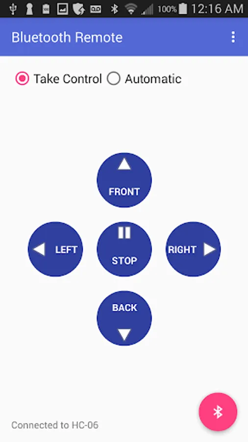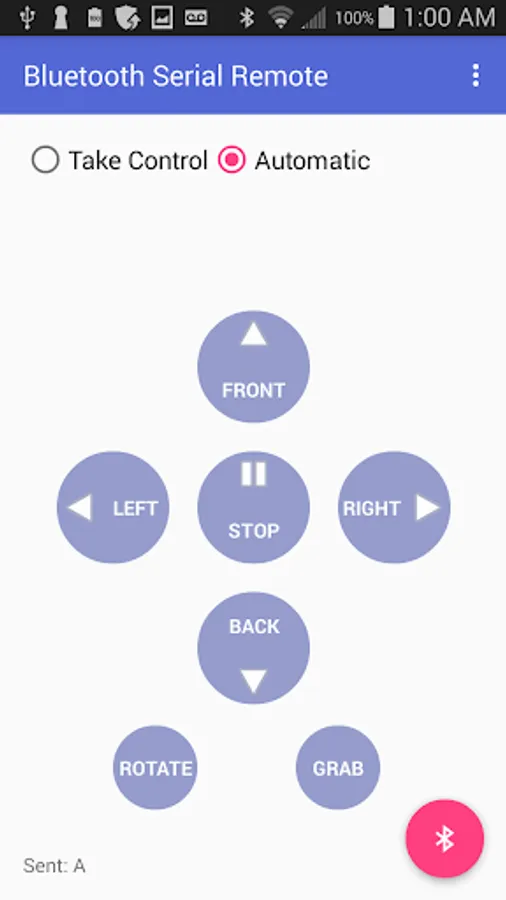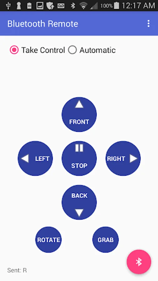 * Once Bluetooth connection has been established, each time a control button is clicked, a single character is sent to the device. The character sent to the other device is shown as a message text.