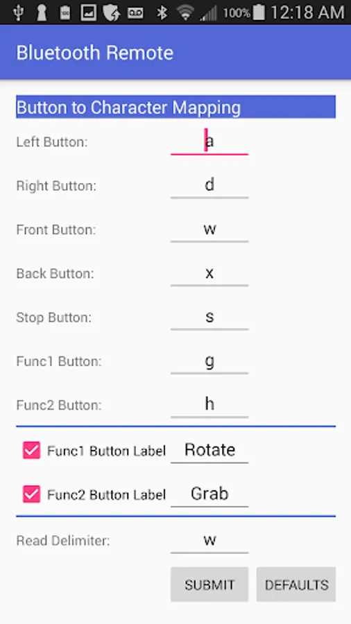 - Any changes to the button-to-character mapping are saved when 'Submit' is clicked; 'Default' reverts to original values