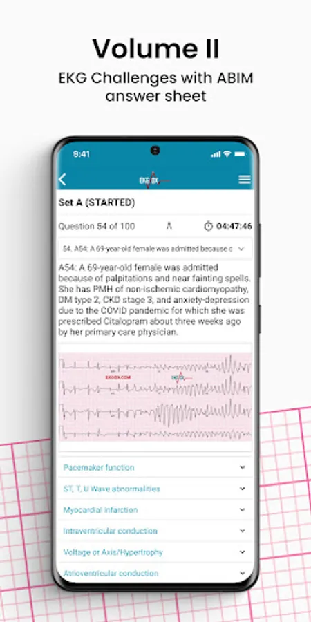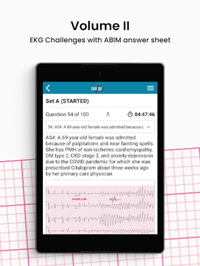 - Volume II (Set A) contains 100 EKG challenges, from basic principles to clinical presentation. Each case study is presented in the standard twelve-lead EKG with ABIM answer sheet, ideally suited for physicians preparing for the Cardiovascular Disease Certification Exam and other exams requiring EKG interpretation.