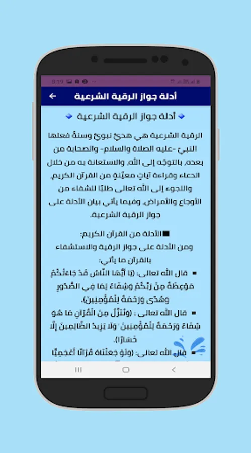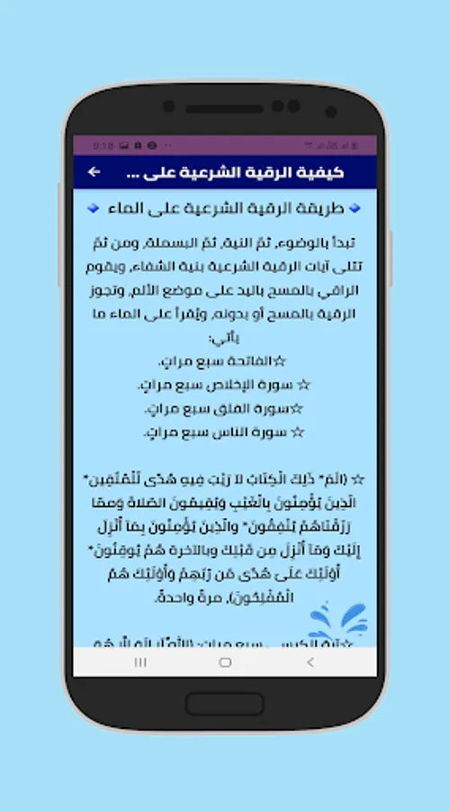 The legal ruqyah is a prophetic guidance and a Sunnah that the Prophet - may God’s prayers and peace be upon him - and the companions after him did, by turning to God, and using him through supplication and reading certain verses of the Noble Qur’an, and resorting to God Almighty for healing from aches and diseases. Therefore, you find in the application the verses of legal ruqyah in Water, where you read these verses to perform ruqyah in water