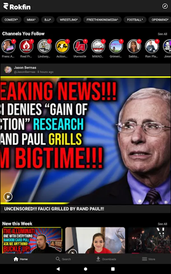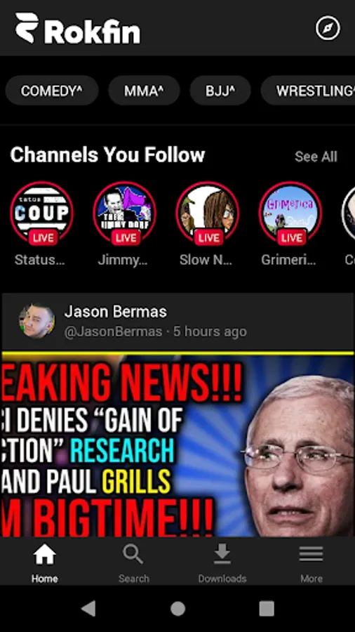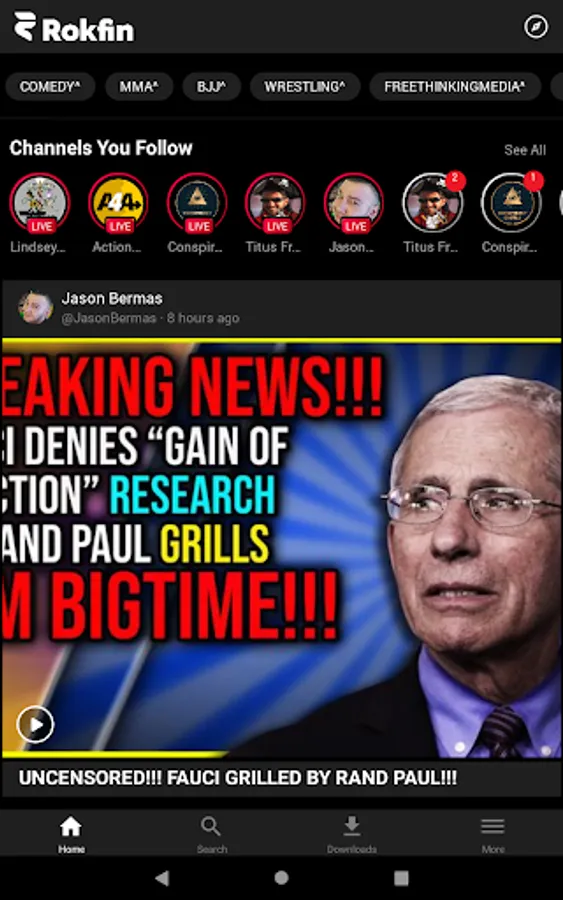 Search and discover bleeding-edge content creators and browse feed topics such as Free Thinking Media, Comedy, and Combat Sports.