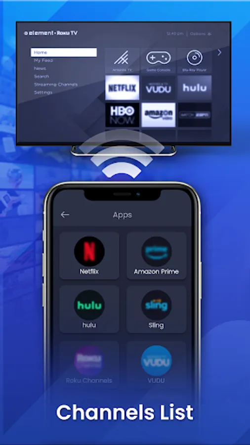 "Element ROKU TV Remote & Cast" is a smart TV control app that gives you an easy and amazing solution to control your Element Roku TV / Devices with any Android Phone. This is a fully functional remote control which gives you the ease of opening apps installed on your Roku TV / devices directly from your Phone.