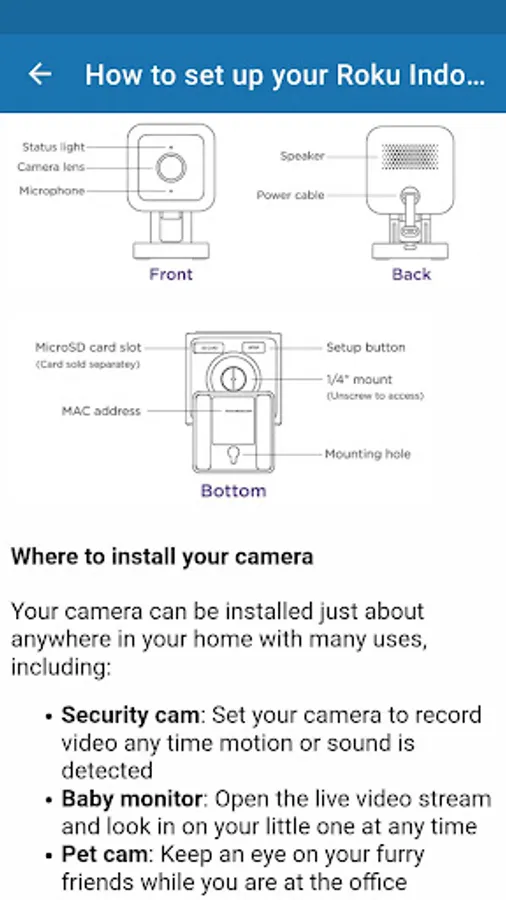 You can learn the information you wonder about Roku indoor camera in the mobile app. How to set up the device, how to adjust motion detection and how view recording are mentioned. For problems you may encounter with your Roku indoor camera 360 se, you can review the mobile app troubleshooting section.