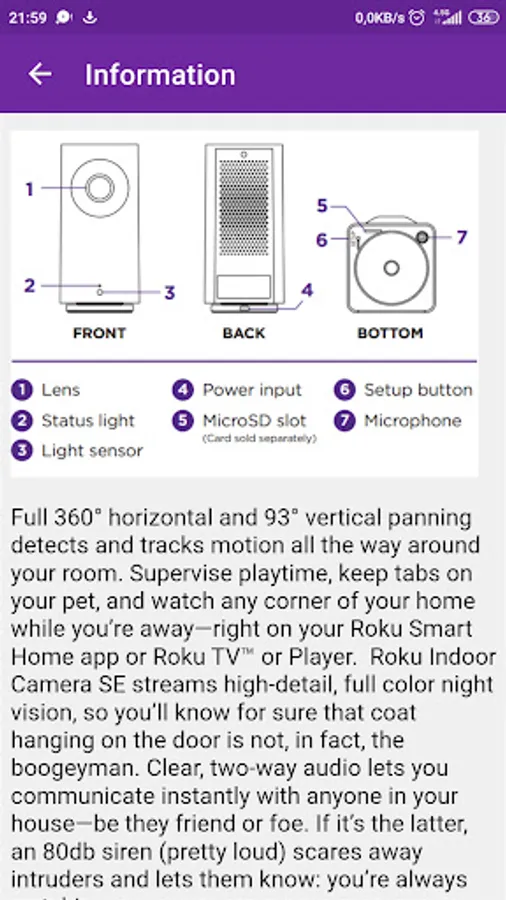 In the content of this mobile application, you can find explanations containing the above titles. This app is a guide with information about Roku Indoor Camera SE.