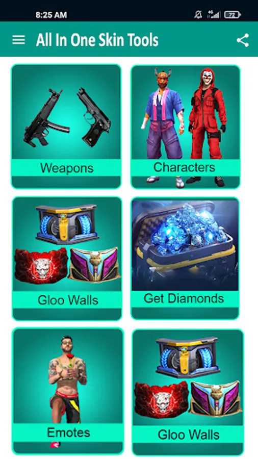 Our app offers a comprehensive collection of all-in-one skin tools for your shooting game. Whether you're a novice or an expert gamer, you'll find everything you need in terms of gun skins, character skins, gloo walls, diamonds, and more within our application. It serves as a valuable resource for gamers of all skill levels.