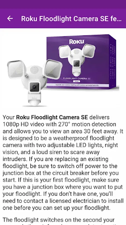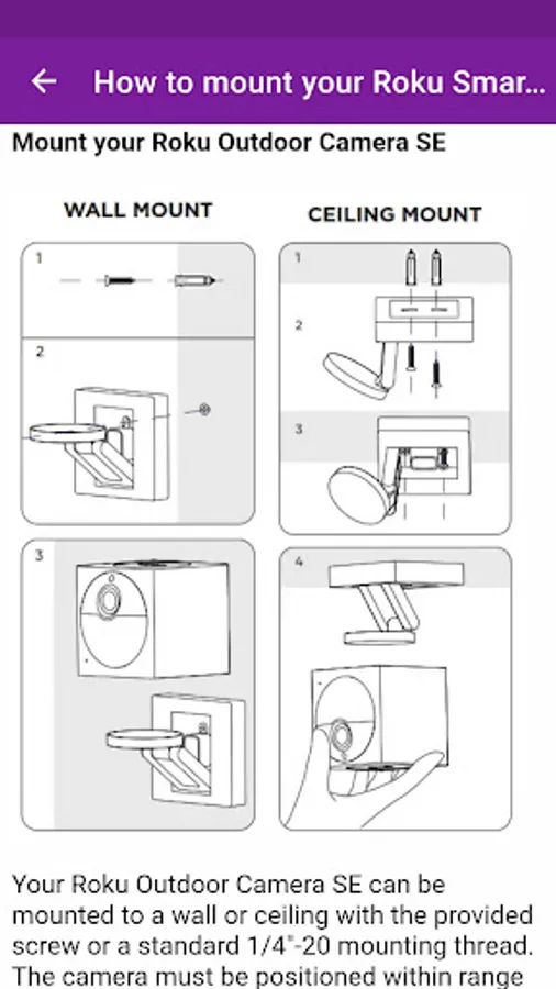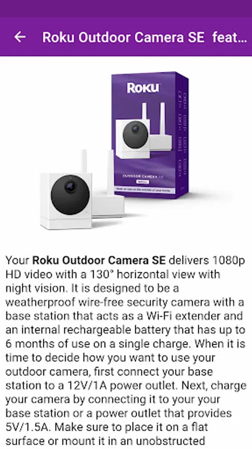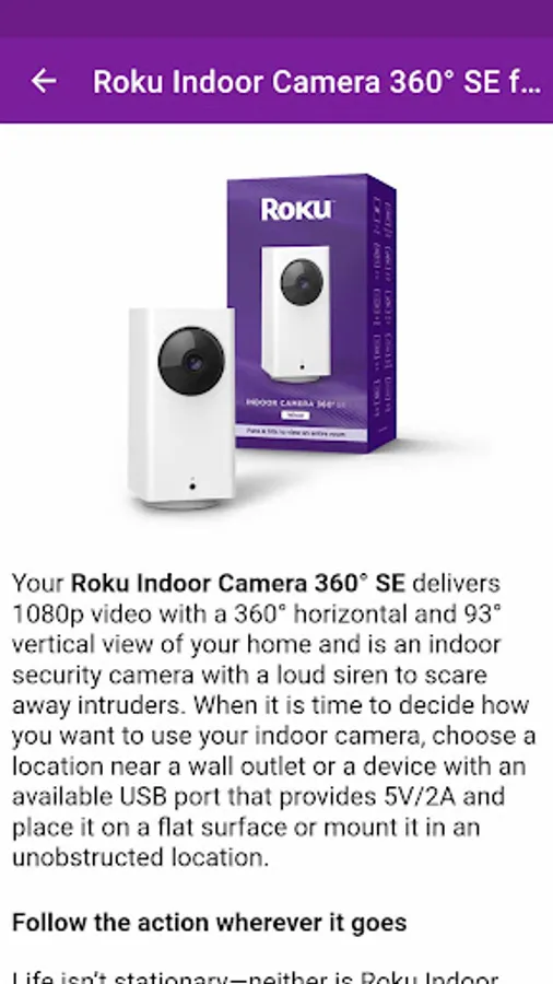 The mobile app includes Roku Smart Home camera features, technical specifications, HOW TO SETUP and how to mount your device.