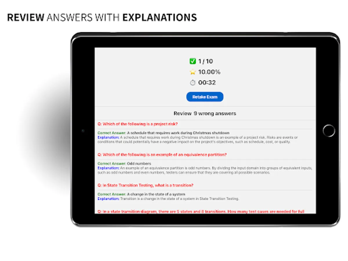While our app is designed to help users prepare for the ISTQB certification exams, it does not guarantee passing the real exam. Our practice exams and study materials are intended to provide practice and feedback, but they may not reflect the exact content or format of the actual exam. Success in the actual exam depends on a variety of factors, including prior knowledge and experience, exam-taking skills, and individual performance on the day of the exam.